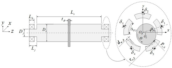 In this research, a flexible rotor-tilting pad journal bearing (TPJB) dynamic behavior is simulated considering the bearing geometrical imperfections. Figure 1 illustrates the presented model for the flexible rotor and TPJBs. In this model, the five pad TPJBs are numerically simulated to obtain the equivalent damping and stiffness coefficients at the equilibrium position of the system. The dynamic coefficients are used to calculate the critical speeds of the flexible rotor and the system behavior at its equilibrium state. Furthermore, the TPJBs’ hydrodynamic and solid-to-solid contact forces were determined at different wear severities for an unbalanced rotor-TPJB system. The equations of motion of the rotor-TPJB system can be written as follows [41]: