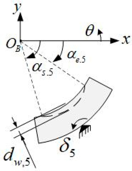 In Equation (8), and represent the pad and the bearing radii, respectively. Furthermore, wear depth for a worn pad is denoted by which can be obtained by the formulation presented in [3]. Since the maximum wear depth occurs in front of the pivot [2], this formulation should be modified for TPJBs as follows: