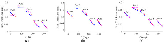 Oil film thickness on intact and worn TPJBs. (a) Shaft rotational speed is equal to 3500 rpm (Sommerfeld No: 0.5283, ) (b) Shaft rotational speed is equal to the first critical speed of the system (Intact bearing Sommerfeld No: 0.7362, worn bearing Sommerfeld No: 0.7984, worn bearing Sommerfeld No: 0.8562, ) (c) Shaft rotational speed is equal to 10,200 rpm (Sommerfeld No: 1.0816, ). (Blue solid line: Intact bearing, Red dashed line: Bearing with maximum wear depth of , Magenta dashed dot line: Bearing with maximum wear depth of ).