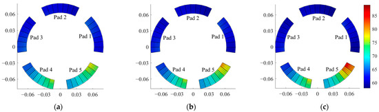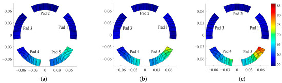 Pad temperature distribution at 10,200 rpm. (a) Intact bearing (b) Maximum wear depth: 10 μm (c) Maximum wear depth: 20 μm (Sommerfeld No: 1.0816, , Axes unit: meter).
