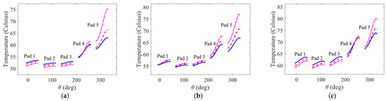 Figure 5, Figure 6 and Figure 7 show the effects of intact and worn TPJBs at two different wear severities on the temperature distribution of the pads at 3500 rpm, the system’s first critical speed, and 10,200 rpm. Furthermore, Figure 8 presents the inner surface temperature of the pads at 3500 rpm, the first critical speed of the system, and 10,200 rpm. Based on Figure 5, Figure 6 and Figure 7, the wear in loaded pads decremented the temperature in the unloaded pads while raising the temperature increase in the loaded ones. This temperature change is due to a shift in the journal equilibrium position towards a location closer to the loaded pads when a worn TPJB is used. Furthermore, the wear-induced temperature variations of the pad are more severe at lower speeds. Considering Figure 8, the fifth pad, which experiences more severe wear, has a higher temperature variation near its trailing edge. This is because the lubricant enters the space between the pad and the journal from the pad’s leading edge at a lower temperature. The pad and the lubricant’s temperature increase along the pad’s arc length, but the pad’s temperature slightly decreases due to convection heat transfer at its trailing edge. Therefore, the maximum temperature in loaded pads will be near the pads’ trailing edge but not exactly on the trailing edge. The point near the trailing edge of the loaded pads is a good location for monitoring pad temperature and detecting TPJB wear at an early stage because of the high temperature variation at this point. The temperature variations of the loaded pads near their trailing edges provide an accurate indicator to determine the wear severity and bearing geometrical imperfections. This phenomenon was described by Lee et al. [2] to diagnose wear in TPJB using an experimental test-rig as well.