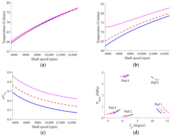 The effect of wear in loaded pads considering variable shaft speed (a) Pad number 4 temperature in 71% of the pad’s arc length from its leading-edge (b) Pad number 5 temperature in 71% of the pad’s arc length from its leading-edge. (c) Journal eccentricity (d) Equilibrium locus of the pads tilt angle versus the maximum pressure on pads for the shaft speed of 3500 rpm to 11,000 rpm (Blue solid line: Intact bearing, Red dashed line: Bearing with maximum wear depth of , Magenta dashed dot line: Bearing with maximum wear depth of ).