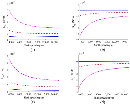TPJB stiffness for intact and worn bearings cases at different speeds (a) (b) (c) (d) (Blue solid line: Intact bearing, Red dashed line: Bearing with maximum wear depth of , Magenta dashed dot line: Bearing with maximum wear depth of ).