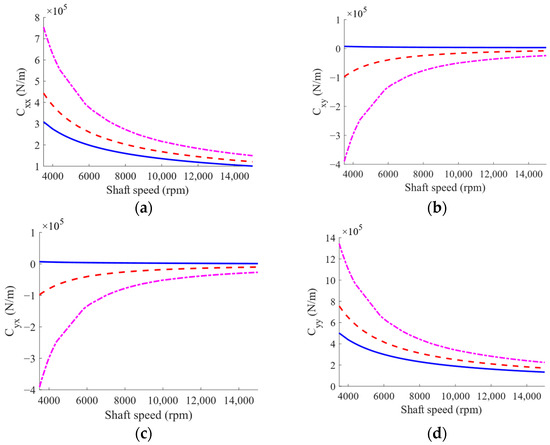 It is worth mentioning that the variations in the lubricant temperature will change the lubricant viscosity, which affects the dynamic coefficients of the system. Here, the TPJB dynamic coefficients are obtained considering the geometrical imperfections of the pads based on the procedure presented in [57]. The perturbed Reynolds equation is solved to obtain the perturbed oil film thickness and pressure, which are then used to calculate the bearing linear dynamic coefficients. These dynamic coefficients are then reduced to the shaft degrees of freedom using the procedure presented in [4]. Figure 10 and Figure 11 shows the changes in the dynamic coefficients of the intact and worn bearings versus the shaft rotating speeds. Accordingly, the dynamic coefficients of the bearing show less sensitivity to geometrical imperfections at higher speeds. This phenomenon can be assigned to the formation of a thicker oil film at higher shaft speed, therefore, the rotor rotates farther than the loaded pads.