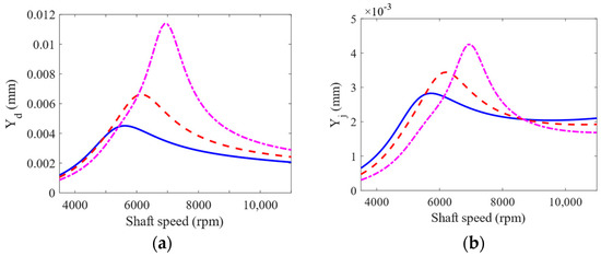 Rotor vibration amplitudes for intact and worn TPJBs considering mass unbalance on disc (a) Disc vibration amplitude (b) Journal vibration amplitude (Blue solid line: Intact bearing, Red dashed line: Bearing with maximum wear depth of , Magenta dashed dot line: Bearing with maximum wear depth of ).
