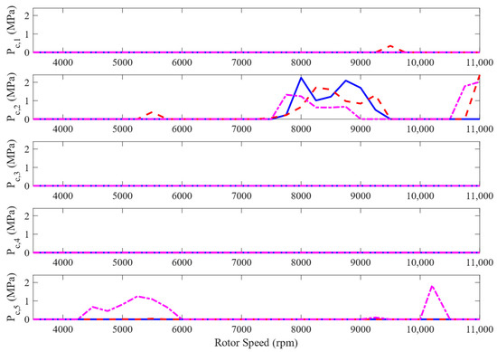 Solid-to-solid contact pressure induced by journal-bearing contact at different speeds for pad No. 1 to pad No. 5 in the intact and worn bearing cases (Blue solid line: Intact bearing, Red dashed line: Bearing with maximum wear depth of , Magenta dashed dot line: Bearing with maximum wear depth of ).
