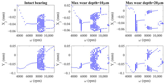 The journal displacement bifurcation diagrams in different speeds for the intact and the worn bearing cases.