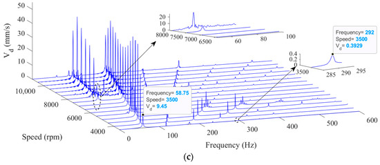 Waterfall diagrams for disc velocity in a range of rotor speeds and different wear severities, (a) Intact bearing (b) Maximum wear depth: 10 μm (c) Maximum wear depth: 20 μm.