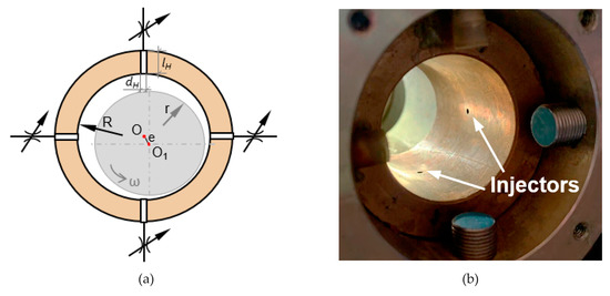 In addition to the basic assumptions required to apply Reynolds Equation (1), a number of additional assumptions have been introduced to focus on the physical basics of the viscous friction reduction effect. The problem was considered isothermal, also excluding taking into account the rotor misalignments, cavitation, and two-phase flows. The parameters of a basic circular hybrid journal bearing considered in this work are shown in Table 1.