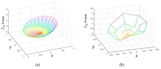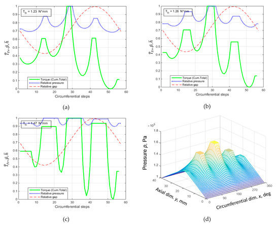 Indeed, Figure 5a,b represent the centered shaft position. In the (b) case, it is a non-equilibrium state, while in the (a) case, it is equilibrium provided by an active lubrication system, which affects the pressure distribution. Since the film thickness is constant in the whole bearing gap, a change in the pressure distribution does not lead to a change in the friction torque. The stresses in the fluid film caused by the pressure gradient cancel each other out. The friction torque value Tvf = 1.46 N∙mm in this case, calculated numerically according to (1), is equal to the minimum possible torque for a plain hydrodynamic bearing, provided only by the shear stresses in the Couette flow.