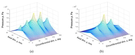 Figure 4. Pressure distributions: (a) in PHB; (a,b) in ALHB at the minimum friction shaft position.