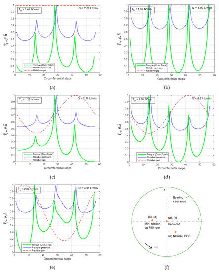 Figure 5a,b demonstrates that, like in a plain bearing, the resulting friction decreases at the centered shaft position in comparison with its natural position, Figure 5e. Indeed, in this case:
