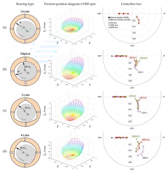 Figure 6. Viscous friction diagrams and centerline loci for actively lubricated journal bearings: (a) circular; (b) elliptical; (c) 3-lobe; (d) 4-lobe.
