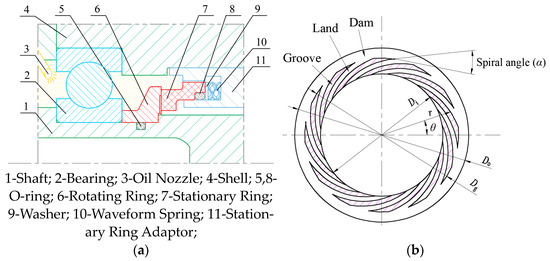 Figure 1a,b show structure of G-LMBPHS and its spiral groove, respectively. The rotating ring, which houses the spiral groove, is made of a harder material to reduce wear, while the stationary ring is made of a softer material. During normal operation, the surfaces of the rotating and stationary rings do not come into contact, and the steady-state operating principle has been extensively discussed in the literature [5]. However, during the low-speed start–stop process, the rotating and stationary rings of G-LMBPHS experience a state of contact and friction for a certain period, similar to most non-contact mechanical seals [9]. The tribological properties of the materials used for the rotating and stationary rings directly affect the sealing performance and service life of the G-LMBPHS. However, the lubrication conditions of G-LMBPHS differ from those of other non-contact mechanical seals. The bearing chamber, where G-LMBPHS operates, contains an oil–air two-phase fluid that is created by mixing the lubricant ejected from the nozzle with the air inside the chamber under the action of the high-speed rotating bearing. The oil droplet diameter and oil droplet content in the oil–air two-phase fluid are influenced by factors such as oil injection volume, nozzle structure, and rotational speed [31,32]. Reportedly, the diameter of oil droplets in the oil–air two-phase fluid is 1 to 3 μm, making it possible to form an oil–air environment by a MQL system.