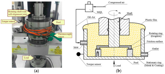 In this study, a Plint Tribology (TE-92, Phoenix Tribology Ltd., Berkshire, UK) was used to study the tribological properties of the G-LMBPHS frictional pair. The torque, COF, and temperature of the stationary ring were monitored during the test. The test device is shown in Figure 2a,b. One ring rotated with the shaft, while the other remained fixed at the bottom of the oil pool with a temperature sensor located near its friction surface. The friction surface was dry and free of lubricant before the test. The oil–air environment was constructed by an MQL system (KS-2106, KINS CO., Ltd., Shanghai, China). The oil used in the MQL system was Shell 555 turbine engine lubricant with a kinematic viscosity of 29.0 mm2/s at 37.8 °C. To avoid contamination of the environment by oil droplets, the oil pool outlet was connected to a filter, and a plastic film was wrapped between the top of the oil pool and the housing to seal the oil–air. During the test, the oil–air circulation is maintained and the percentage of lubricant in the oil–air is 4% (mass ratio).