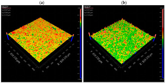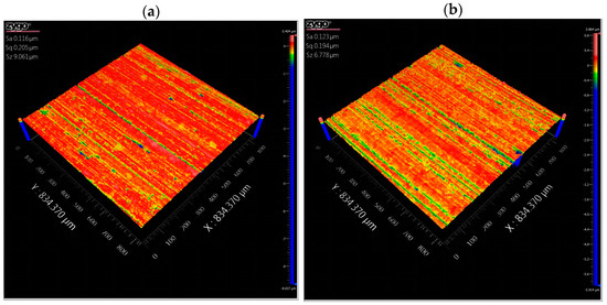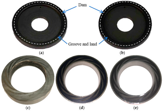 The structural parameters of the spiral grooves are detailed in Table 2. The spiral grooves were machined on the surface of the hard ring using a fiber laser machine (YLP-20, HANS LASER, Shenzhen, China), followed by surface polishing to eliminate any impurities. The depth of each spiral groove was measured within 4.8~5.6 μm using the 3D non-contact image measuring instrument. The surface roughness after polishing was 0.070 μm, 0.005 μm, and 0.021 μm for 18Cr2Ni4WA, Al2O3 coating, and Cr2O3 coating, respectively. The inner side of the white dashed line of the soft ring shown in Figure 3a,b represents to the groove and land of the hard ring, while the outer region corresponds to the dam.