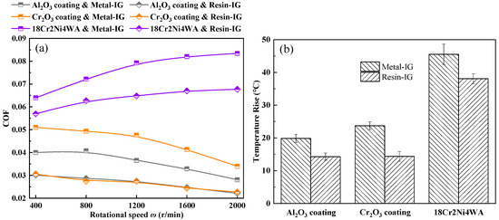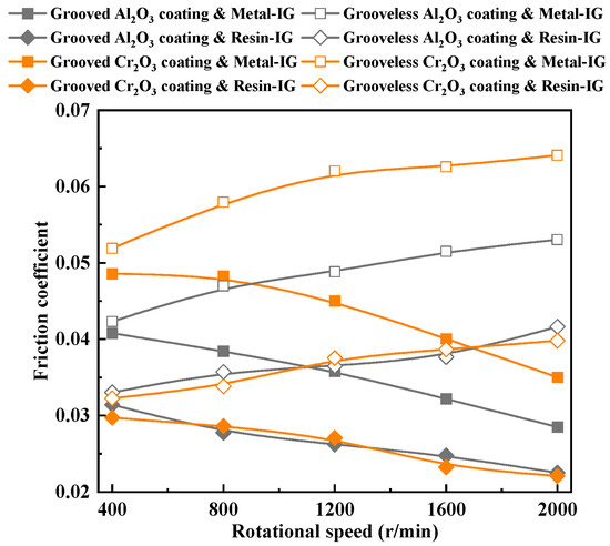 In the oil–air environment, the COF of the four frictional pairs consisting of Al2O3 coating and Cr2O3 coating gradually decrease with increasing speed [25,44], while the COF of the frictional pair of 18Cr2Ni4WA with graphite, on the contrary, gradually increases. This phenomenon can be attributed to three main reasons. Firstly, the lubricant on the friction surface maintains a dynamic equilibrium. The lubricant in the oil–air environment is constantly adsorbed to the friction surface, and the lubricant is constantly leaving the inner and outer sides of the friction surface under rotational speed and load, while carrying the graphite abrasive dust generated during the friction process. Secondly, the hydrodynamic effect of the spiral groove reduces the contact force on the friction surface. Thirdly, the micron-sized spiral groove is able to contain and discharge the abrasive dust, preventing them from continuously damaging the friction surface. The COF of the four frictional pairs consisting of Al2O3 coating and Cr2O3 coating rapidly decreases, while the slow increase in COF of the frictional pair of 18Cr2Ni4WA with graphite reflects the influence of these aspects. The COF of the four frictional pairs consisting of Al2O3 coating and Cr2O3 coating decreased by 2.4% to 3.8% when the speed was increased from 400 to 800 r/min, and decreased by 10.5% to 14.1% when the speed was increased from 1600 to 2000 r/min. The oil–air environment has a minimal effect on the hard coating because the coating and IG have a small COF, produces less abrasive dust, and the coating is less susceptible to wear. However, for 18Cr2Ni4WA and IG, the oil–air environment is unfavorable because 18Cr2Ni4WA is relatively soft and easy to wear, and because the graphite abrasive dust keeps leaving the friction surface with the lubricant, graphite is not easy to form a stable transfer film on the surface of 18Cr2Ni4WA [44], which further aggravates the wear of 18Cr2Ni4WA and leads to an increase in the COF. After the 18Cr2Ni4WA and IG test, a light black lubricant was observed in the oil pool, while the color of the lubricant after the tests of Al2O3 coating and IG and Cr2O3 coating and IG was almost unchanged, indicating that the coating can effectively reduce the wear of graphite.