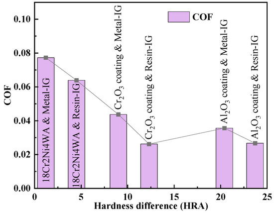 For commonly used frictional materials, an inverse correlation trend can be observed between the COF of the frictional pairs and the difference in hardness between the hard and soft materials, as shown in Figure 5. The four data points on the left side represent the frictional pairs composed of 18Cr2Ni4WA, Cr2O3 coating, Resin-IG, and Metal-IG, respectively. The COF of the frictional pairs decreases rapidly with an increase in the hardness difference between the materials. A similar phenomenon was observed in the study by Li [41]. Generally, the COF of the frictional pair is positively correlated with the load [42,43], and it can be concluded that the higher the contact pressure of the frictional pair, the higher the COF. Hard materials are less prone to plastic deformation, while soft materials are prone to plastic deformation. When two materials with a larger hardness difference are in contact, the softer material undergoes plastic deformation, resulting in a larger contact area and a more uniform contact pressure, and ultimately a smaller COF. Although the hardness difference between Al2O3 coating and Metal-IG and Al2O3 coating and Resin-IG was the largest, the COF of them increased slightly instead. In general, in the oil–air environment, a smaller COF of frictional pair can be obtained by selecting two materials with a larger hardness difference.