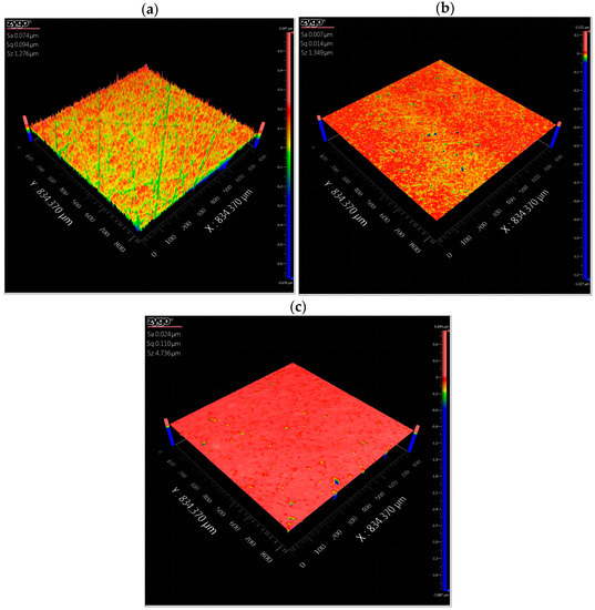 Since the high-speed bearing chamber may be subjected to loads such as shock and vibration, the ductile material 18Cr2Ni4WA was selected as the substrate and sprayed with Al2O3 ceramics and Cr2O3 ceramics on its surface for hard ring, as shown in Figure 3c–e. Although the theoretical hardness of Al2O3 and Cr2O3 is large, their actual hardness is affected by the microscopic defects generated during the machining process [38,39,40]. The inner and outer diameters of the hard rings are Ф 38.0 mm and Ф 54.0 mm, respectively. The material properties of the soft and hard rings are detailed in Table 1. The planarity of the test rings was measured by a flat light band tester (BY-150, BYJL CO., Ltd., Ningbo, China), and all the test rings showed 1~2 sodium light interference bands, indicating planarity of 0.3~0.6 µm. The parallelism of the test rings was measured by a 3D non-contact image measuring instrument (TM-151510CAZ, Beijing, China), and the parallelism of all the test rings was 0.008~0.015 mm.