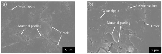 The SEM micrographs of the Metal-IG and Resin-IG after the friction testing are shown in Figure 10. Graphite is prone to wear due to its porous structure and poor mechanical properties. The surface of Metal-IG exhibited less flakes and marks than that of Resin-IG, indicating that Metal-IG has significant anti-wear properties. The mechanical properties of Resin-IG were poorer and the surface showed more severe abrasive wear accompanied by material spalling [42,45]. Zhao et al. [46] have demonstrated that Metal-IG exhibits a stable friction regime and superior anti-friction and anti-wear properties compared to Resin-IG. In addition, the impregnated material (metal or resin) can enhance the strength of the graphite matrix and promote the formation of graphite tribofilm on the corresponding surface, which is beneficial to reducing friction and wear.