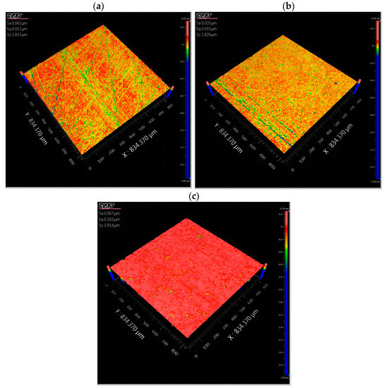 The microscopic morphology of the three hard materials before and after the test is shown in Figure 11. Interestingly, the surface roughness after the test was observed to be smaller compared to that before the test, pointing towards the occurrence of abrasive wear and adhesive wear in 18Cr2Ni4WA. In contrast, minimal wear marks were observed on the surfaces of Al2O3 coating and Cr2O3 coating, indicating that the frictional pairs composed of hard coatings and graphite had good tribological properties in oil–air environments.