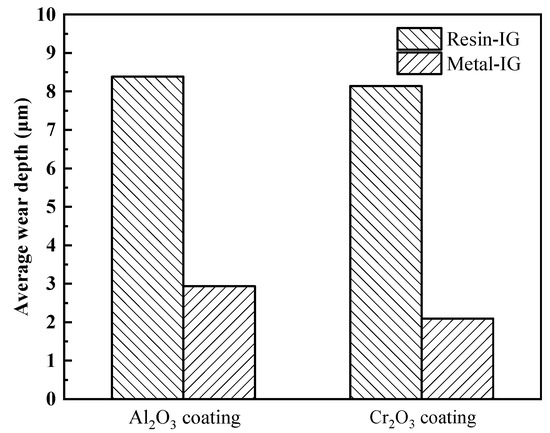Wear tests were conducted on four frictional pairs consisting of Al2O3 coating, Cr2O3 coating, Metal-IG, and Resin-IG, and the test procedure in Table 3 was repeated 24 times for each frictional pair, i.e., 10 h of friction tests were conducted for each frictional pair. The wear depth of the friction surface of graphite was assessed by calculating the mass loss of the graphite before and after the test, as shown in Figure 12.