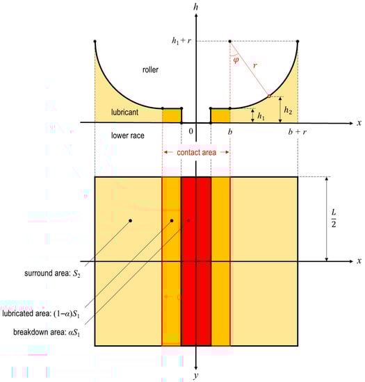 Figure 1 depicts a geometrical model of an EHD line contact area and its surroundings under mixed lubrication conditions with a thrust needle roller bearing. Furthermore, the h axis is the axis in the oil film thickness direction, the x axis is the axis in the rolling direction, and the y axis is the axis that is perpendicular to it. Additionally, h1 is the oil film thickness in the oil film-forming part of the contact area, b denotes the contact half-width, r denotes the roller radius, L denotes the straight part of the roller’s length, S1 denotes the apparent contact area, S2 denotes the roller surface area surrounding the contact area (note that S2 in Figure 1 represents the projected area on the xy plane), and α denotes the breakdown ratio (i.e., 0 ≤ α ≤ 1). Consequently, the surface upon which the breakdown (that is, h = 0) occurs in the EHD line contact is represented by αS1, as shown in Figure 1.