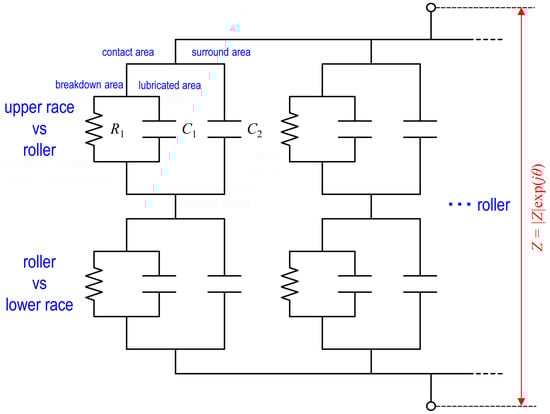 Subsequently, Figure 2 shows the equivalent electric circuit of the thrust needle roller bearing. More specifically, R1 in Figure 2 denotes the electrical resistance in areas wherein oil film is breaking down, C1 denotes the capacitance in the oil film formed area within an EHD line contact, and C2 denotes the capacitance in the straight part of the roller around an EHD line contact, respectively. As shown in Figure 2, in this study, it is assumed that all contact areas are represented by the same equivalent circuit. The contact areas in the upper and lower races are connected in their respective series circuits, and these are joined by parallel circuits, which are equal in number to the rolling elements. This implies that this method determines the average value of the oil film thickness and breakdown ratio in all contact areas. In Figure 2, R1, C1, and C2 are each represented by their respective equations, as follows: