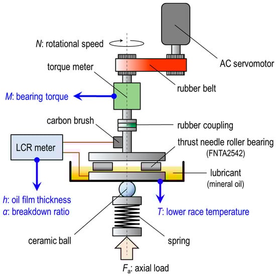 In recent years, due to the growing concern over global warming [], roller bearings that are used in the sliding components of various machines have been required to produce even lower torque. To reduce bearing torque, measures such as decreasing the viscosity of lubricants or reducing the lubricant fill amount have been taken. However, this may promote oil film breakdown in elastohydrodynamic (EHD) contacts [] that use roller bearings, thus leading to various types of surface damage [,,]. Consequently, ideal theoretical lubrication conditions for further reducing the torque of roller bearings may involve thinning the oil film within a contact area as much as possible without causing breakdown. Notably, the thickness and breakdown ratio of oil films in EHD contacts are crucial indices for lubrication conditions. Furthermore, as the impact between the rolling elements and the cage also affect the oil film thickness [], visualization techniques are needed to clarify the actual lubrication conditions of the roller bearings. Numerous studies have explored methods for monitoring the lubrication conditions of EHD contacts. Optical interferometry [,,,,,,,] is particularly popular, as it can accurately measure oil film thickness in EHD contacts. However, it requires the use of light-transmitting materials, and therefore, it cannot determine the lubrication conditions of actual ball bearings. Electrical methods [,,,,,,,,,,,,,,,,,,] can be a potential solution for monitoring the lubrication conditions of non-light-transmitting materials. There are three main types of electrical methods: the electrical resistance method [,,,,], electrical capacitance method [,,,,,,], and electrical impedance method [,,,,,].