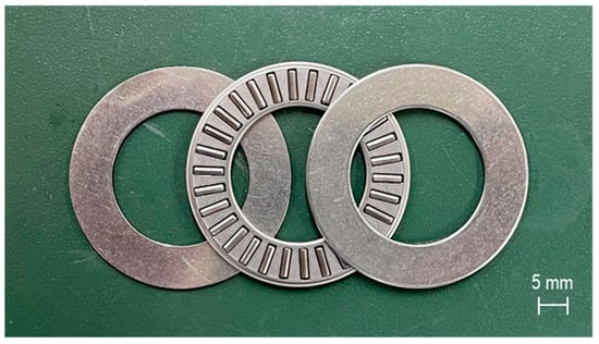 Figure 4 shows an image of the external appearance of the test bearing used in this study. The test bearing was a thrust needle roller bearing FNTA2542 (inner diameter: 25 mm, outer diameter: 42 mm), n = 30, roller radius r = 1.0 mm, length of the roller’s straight part L = 4.6 mm, roller’s total length Lt = 5.6 mm, and roller end face chamfer curvature rc = 0.5 mm. Additionally, the roller material was SUJ2 (Young’s modulus: 208 GPa, Poisson’s ratio: 0.3). Furthermore, the material of the upper and lower races used in this test (inner diameter: 25 mm, outer diameter: 42 mm, thickness: 1.0 mm) was SK5 (Young’s modulus: 206 GPa, Poisson’s ratio: 0.3), and the material of the cage was SPCC (Young’s modulus: 205 GPa, Poisson’s ratio: 0.3). Additionally, the root-mean-square roughness, Rq1 and Rq2, of the rollers and upper and lower races are Rq1 = 0.15 μm and Rq2 = 0.12 μm, respectively. As the test bearing is an actual product and the manufacturing errors of the rollers and races (roundness, waviness, etc.) vary within their respective tolerances, the experimental results are affected by these factors; however, the developed method measures the average value of the total contact area when an axial load is applied, which mitigates the effects of the variation.