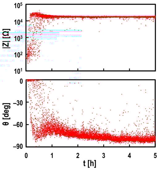 Time evolution of the measured modulus |Z| (top) and phase θ (bottom); bearing: FNTA2542, lubricant: mineral oil, rotational speed: N = 3000 min−1, axial load: Fa = 1.5 kN, RMS amplitude: Ve = 1.1 V and frequency: f = 10 kHz; red plots in graphs: measured values by LCR meter.