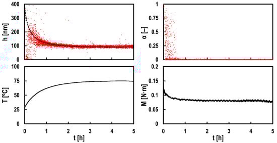 Time evolution of the measured oil film thickness h (top left), breakdown ratio α (top right), lower race temperature T (bottom left), and bearing torque M (bottom right); bearing: FNTA2542, lubricant: mineral oil, rotational speed: N = 3000 min−1 and axial load: Fa = 1.5 kN; red plots in graphs: measured values using the electrical impedance method; black broken line in top left graph: theoretical prediction at T using the Ertel–Grubin equation [].