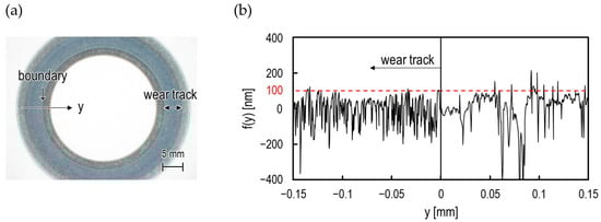 Observations of the lower race surface after the experiment; (a) photograph of the wear track and (b) surface roughness profile around the boundary of the wear track; black vertical line at y = 0 in (b): boundary of the wear track; red broken line in (b): f(y) = 100 nm.