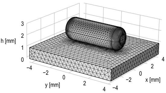 In this study, as shown in Figure 1 and Figure 2, the capacitance C2c generated in the chamfer of the roller end face was ignored, and oil film thickness was determined using the capacitance C2 generated only in the straight part of the roller. However, to be precise, the oil film thickness should be calculated using the total capacitance C2t, which reflects the actual roller shape, including the chamfer of the roller end face. Therefore, we calculated C2t using the finite element method (FEM) [], and we compared it with the C2 obtained from Equation . The simulations were performed using COMSOL® Multiphysics (version 6.0), employing the AC/DC module. More specifically, the simulations were performed by assuming that the roller and race were made of steel and filled with test oil (mineral oil). The race and analytical boundary were grounded, and a potential of 1 V was applied to the roller. Figure 8 shows the triangular mesh that was automatically assigned by the software to the roller and race geometry that was used in the simulations. Furthermore, in this simulation, we did not consider elastic deformation (i.e., Fa = 0 N). Hence, given that this FEM analysis does not consider C1 occurring in the EHD line contact, it implies that it can simply be compared with C2, as obtained from Equation .