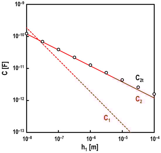 Effect of a chamfer at the roller edge on capacitance between the roller and race for varying oil film thickness h1 with no breakdown area (i.e., α = 0); lubricant: mineral oil and Fa = 0 N; red line in graph: theoretical prediction C2 using Equation ; black open circles in graph: simulated values C2t using COMSOL® Multiphysics; red broken line in graph: theoretical prediction C1 at Fa = 1.5 kN using Equation .