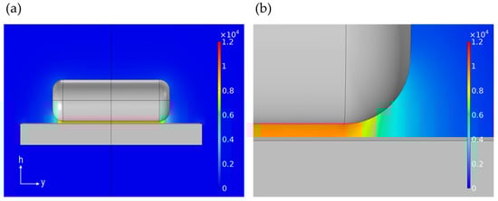 Electric field distribution in the yh plane at x = 0; (a) the entire view of simulation and (b) the enlarged view of the chamfer at the roller edge; oil film thickness: h1 = 100 μm, lubricant: mineral oil and Fa = 0 N; color bar in simulated results: electric field strength: E [V/m].