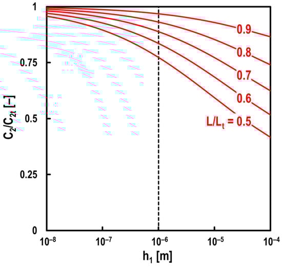 Relationship between the oil film thickness h1 and ratio of C2/C2t for the varying ratio of L/Lt with no breakdown area (i.e., α = 0); lubricant: mineral oil, Fa = 0 N, radius of roller: r = 1.0 mm and chamfer curvature at roller edge: rc = 0.5 mm; red lines in graph: theoretical prediction using Equation and COMSOL® Multiphysics; black broken line in graph: h1 = 1 μm.