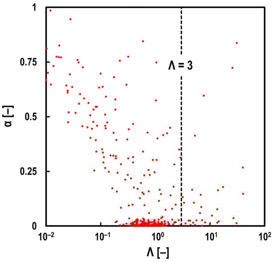 Relationship between film parameter Λ and breakdown ratio α; bearing: FNTA2542, lubricant: mineral oil, rotational speed: N = 3000 min−1 and axial load: Fa = 1.5 kN; red plots in graph: measured values using the electrical impedance method; black broken line in graph: Λ = 3.
