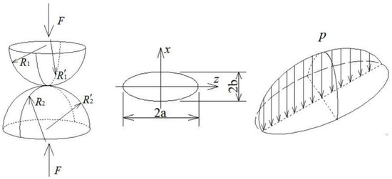 To establish a wheel–rail contact model, we combine Hertz’s contact theory with finite-element analysis, where we use Hertz’s contact theory to describe linear elastic small deformation of the contact surface and use the finite-element method to solve the nonlinear behavior of the contact surface. Hertz’s contact theory defined the contact state of finite-element models in an initial stationary state and was used to compare the contact spot shape and stress calculated by the finite-element method. Hertz contact theory assumes that the wheel–rail contact area is elliptical, and the pressure distribution on the contact surface is semi-ellipsoidal, as shown in Figure 1.