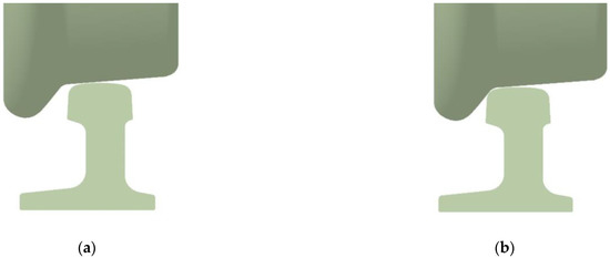 The load transfer from the wheel to the track produces an elliptical contact area. The contact area includes the adhesion area and slip area, and the adhesion area is formed at the front of the contact ellipse, while the slip area is formed at the end [26]. Once the traction force reaches its saturation value, the whole contact area changes to a pure sliding state, producing sliding between wheels and rails, as shown in Figure 2. At this time, it is easy to produce a large-wheel-pair traverse, resulting in contact between the wheel rim and rail gauge angle. At the same time, wheel hub is contacting rail tread. As shown in Figure 3, two connected friction contact pairs are established on a workbench, the dry-state conditions of the two contact pairs’ friction coefficient are taken as 0.4, and lubrication schemes are developed for the rail top friction adjustment, rail side lubrication, and both together. To model the lubrication layer, the surface-coating feature of ANSYS Workbench was used. The software provided a mechanical lubricating oil as the coating material with a density of 8.89 × 10−7 kg/mm3, a thermal conductivity of 0.000145 W/mm·°C, a specific heat of 1.845 × 106 mJ/kg·°C, and a viscosity of 1.06 × 10−6 MPa·s. The optimal coefficient of friction and coating thickness for the lubrication layer were selected based on the position of the friction pair and recommendations given in reference [23], resulting in a coating thickness of 0.1 mm. The friction coefficient is 0.2 when the friction modifier is applied on the rail top and 0.1 when the lubricant is applied on the rail side. The friction behavior is set to be symmetrical, and the equation uses the generalized Lagrangian method to update the stiffness at each iteration and define the heat-transfer effect on the contact surface.