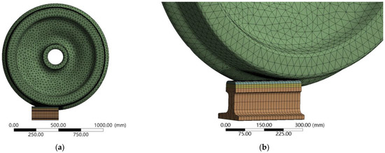 Different mesh accuracies are set along different depths of the rail contact interface, as shown in Figure 4. The mesh is refined in the contact area, the mesh size is encrypted to a minimum of 0.5 mm, and a coarse mesh is used for the other parts. The finite-element model has 298,178 nodes and 241,761 cells. In the coupled-field-transient model, the ambient temperature is set to 25℃, the thermal-convection coefficient is set to 12 W/(m2·K), and the thermal-radiation emissivity is 0.95 for the wheel–rail frictional heat-generating surface [27]. The vertical displacement of the bottom surface of the rail, the longitudinal and transverse displacement of the rail end surface on the near-wheel side, and the transverse displacement of the far-wheel end are constrained. The heat flux transmitted outward is set at both end faces, simulating the internal heat flow of the rail. Operating conditions are set for wheel sliding speeds of 1 m/s and 2 m/s and train axle weights of 20 t and 30 t. The axle loads are applied as vertical bearing loads on the axle center. Under different axle weight conditions, a single wheel supports bearing loads of 10 t and 15 t. The contact model is generally within the linear elastic range, where the mechanical properties and material properties are in accordance with linear elasticity. However, the effect of temperature on materials is nonlinear. The finite-element method is used to solve the influence of temperature on the contact characteristics of the friction surface. The model establishment and calculation are accomplished by using finite-element software.