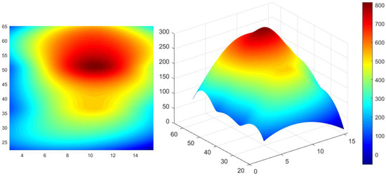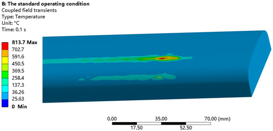 Dry wheel–rail contact with a sliding speed of 2 m/s and an axle load of 30 t is set as the standard operating condition. Figure 5 shows the friction-temperature patch of the two contact points under the standard operating condition when sliding 200 mm. The center temperature of the contact patch on the rail top is 813 °C, and the center temperature of the contact patch on the rail side is 547.7 °C. The frictional temperature rise on the rail side is 67% of that on the rail top, and the temperature dissipates faster. As shown in Figure 6, the shape of the contact area basically agrees with the Hertz contact theory model, with a skewed peak-shaped temperature field. The high-temperature points are located in the rear half of the contact area. Due to the cooling effect of the rail material that first contacts the wheel on the friction heat, the temperature rises instantaneously and then contacts the rear half of the contact area. A good correlation was found between the analytical results and the experimental data in the literature [6,28].