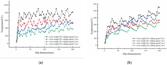 Figure 7 shows the variation curves of the contact-patch temperature rise with slip distance. The temperature-rise trend presented is in agreement with the existing dry-state sliding-friction flash-temperature model, and the contact-spot temperature prediction has an asymptotic relationship with the results of the flash-temperature calculation [29,30,31]. The highest temperatures of α and β under operating condition 1 are 904.9 °C and 554.6 °C; the highest temperatures of α and β under operating condition 2 are 619.3 °C and 467.1 °C; the highest temperatures of α and β under operating condition 3 are 685.9 °C and 363.8 °C; and the highest temperatures of α and β under operating condition 4 are 497.8 °C and 334.5 °C. The highest temperature of the contact patch on the rail side under different operating conditions is 55–75% of the highest temperature of the contact patch on the rail top. The differential value between the two is 152.2 °C for operating condition 2 and 163.3 °C for operating condition 4. This means that the maximum temperatures of the two contact patches at a low sliding speed are similar. The rail top temperature tends to be stable and fluctuates in a small range after sliding 50 mm, and the curve spacing is larger at different speeds with the same axle load. This indicates that the sliding speed has more influence on the friction-temperature rise at the rail top. The temperature on the rail side regularly rises with the sliding distance. In Figure 7b, the positions of curves 2 and 3 are exchanged, which shows that the axle load has a greater influence on the friction-temperature rise on the rail side.
