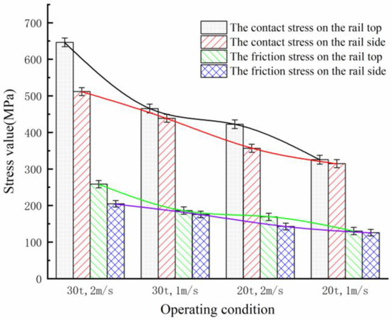 The friction-stress values at the rail side under the four conditions are 204.7 MPa, 175.5 MPa, 142.7 MPa, and 125.9 MPa. The contact-stress values are 511.7 MPa, 438.7 MPa, 356.7 MPa, and 314.6 MPa. The differential value of friction stress at the rail side with the same axle weight and different speeds is within 30 MPa. The differentials are more than 50 MPa for different axle weights at the same speed. The differential value of contact stress on the rail side with the same axle weight and different speeds is between 40 and 70 MPa. The differentials between the same speed and different axle weights are more than 120 MPa. This indicates that axle weight plays a major role in influencing the two types of rail side stresses analyzed, while the effect of speed is very limited.