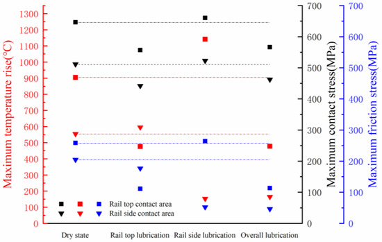 The frictional-heating and contact-stress values for the rail gauge angle account for more than 60% of the rail top. Additionally, the rail gauge angle structure is more fragile and does not have a good force relationship [32]. Long-term neglect of frictional heating at the gauge angle can lead to material softening, derailment, and other major traffic safety accidents. On train lines with heavy axle loads, snaking movements, acceleration and deceleration sections, and small-radius curves, rail-cooling devices and corresponding lubrication works should be installed. This can help to avoid and improve thermal rail damage caused by wheel transverse displacement and wheel–rail sliding friction. This paper analyzes the cooling effect and stress improvement under three lubrication coating schemes and guides the corresponding maintenance work. Condition 1 is set as a dry condition as the control. The effect of the lubrication state on wheel–rail thermal–mechanical coupling is shown in Figure 9.
