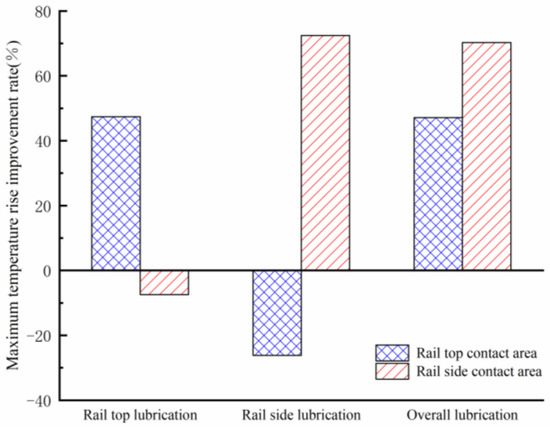 The rail top solid friction modifier reduces the temperature at α by 428.9 °C but increases the temperature at β by 42.3 °C. The rail side solid friction modifier significantly reduces the temperature at β but increases the temperature at α by 236.6 °C. The temperature at α is as high as 904.9 °C under the original dry condition and reaches 1141.5 °C after applying the rail side lubricant. This indicates that the application of a friction agent to a single-contact area leads to a significant reduction in frictional heat in the contact pair, but raises the temperature of the other contact pair. This side effect can be avoided with overall lubrication, and a good improvement can be achieved for both contact areas. The improvement rates are 47.1% and 70.3%, as shown in Figure 10.