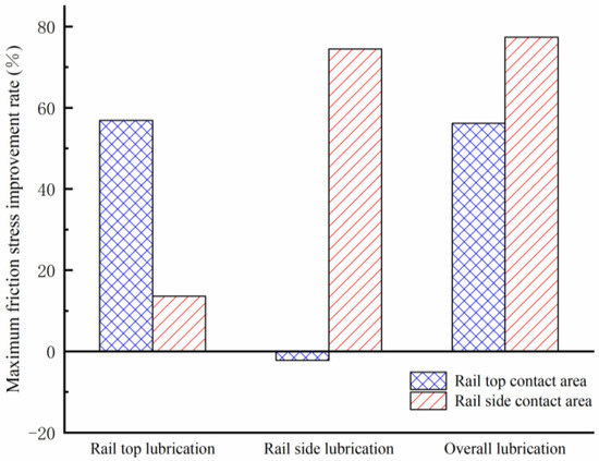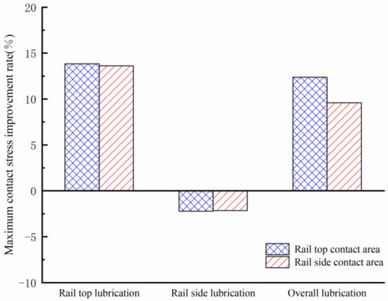 The contact stresses of both friction pairs are reduced under both rail top friction and overall lubrication schemes. The improvement rate ranges from 9 to 14%, as shown in Figure 11. The effect of coating the rail top friction modifier alone is better than that of co-lubrication. In contrast, coating the rail side lubricant leads to a simultaneous deterioration in the contact-stress state at both contact interfaces.