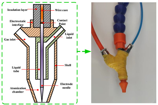For low-conductivity lubricants used in MQL, such as vegetable oils and synthetic greases, contact charging exhibits higher charging efficiency. Additionally, the contact charging spray assembly structure is simpler in terms of design. Existing two-phase flow atomization nozzles typically have a metallic outer shell and outlet at the end, which can be directly connected to the electrostatic device via a conductor to function as a contact charging nozzle. However, such nozzles lack a dedicated electrostatic interface, and directly connecting the conductor to the metallic outer shell exposes the electrode to the air, posing safety hazards to machine tools and operators. To address this issue, the nozzle is modified and upgraded by changing the electrode to a needle-shaped structure located at the nozzle’s center and replacing the nozzle casing and gas-liquid passages with insulating materials. The structure and physical representation of the nozzle is shown in Figure 1. An electrostatic interface is reserved at the top of the nozzle, and the high-voltage cable’s internal wire core end is polished flat to make contact with the similarly polished flat end of the electrode needle, forming a contact connection when pressed together. Once the nozzle is connected to the electrostatic device, the lubricant enters the liquid pipe through the inlet, contacts the electrode needle for charging, and subsequently atomizes within the atomization chamber.