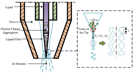 The needle-shaped electrode in the nozzle designed in this study is located within the liquid tube, and a gap is formed between the surface of the electrode base and the inner wall of the liquid tube. The lubricant flows out of the gap and forms a liquid film on the surface of the electrode needle. Due to the drainage effect of the electrode needle, the liquid converges at the tip of the needle electrode, where the thickness of the liquid film is the greatest. As a result of the influence of the airflow field and electric field, disturbances in the liquid film are most likely to occur at this location, as shown in Figure 3.