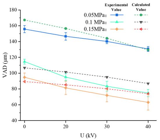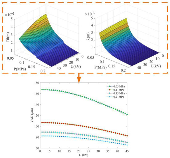 To solve the model of VAD, we analyze the changes in jet diameter and wavelength under different operating conditions to compare their effects on the VAD. The trends are shown in Figure 4. The jet diameter decreases with increasing gas pressure and voltage, but as the gas pressure increases, the changes in jet diameter with voltage tend to become more moderate. The wavelength is mainly affected by gas pressure; when the gas pressure remains constant, the wavelength remains almost unchanged with increasing voltage. Under constant gas pressure, changes in jet diameter have a more significant effect on VAD, while under constant voltage, changes in wavelength have a more significant effect on VAD. It can also be observed that the high-voltage electric field has a noticeable refining effect on VAD.